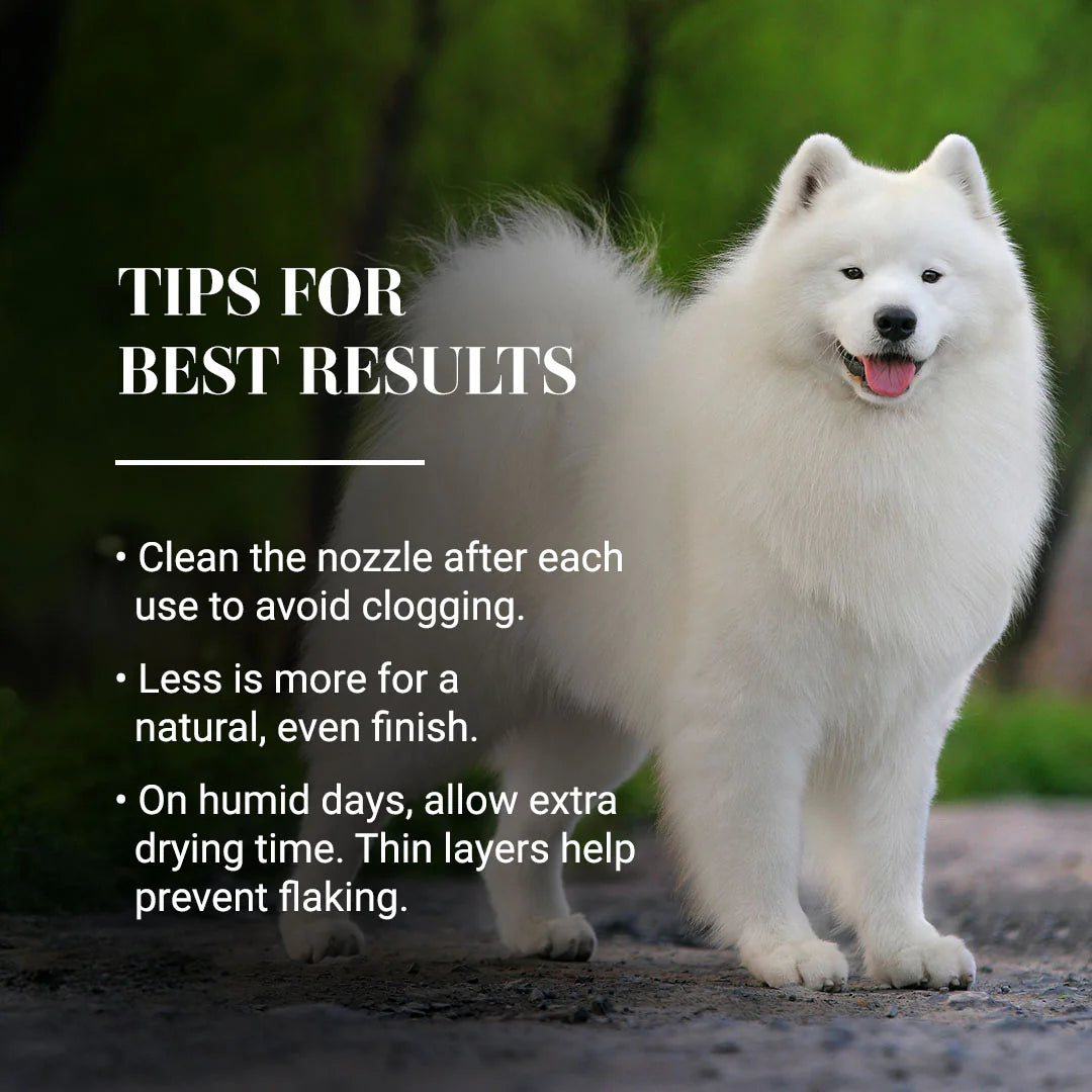 Chris Christensen Black Ice Coat Spray is a professional-grade color enhancer designed to deepen dark tones and cover discoloration on your dog's coat. The White Ice Coat Spray is designed to brighten and whiten those 'hard to get white areas' such as PH and urine stains. The featherlight formula blends effortlessly for a natural finish, concealing stains and imperfections such as elbow calluses and sun-faded fur. This 3oz aerosol delivers a soft, show-ready texture without adding weight, making it ideal for precision touch-ups and overall coat enhancement. For best results, shake thoroughly to activate the rich pigment before application.