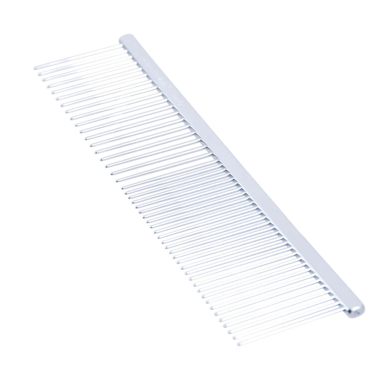 Engineered for long-coated breeds, the Chris Christensen Greyhound-Style Buttercomb combines dual-tooth spacing for comprehensive coat care. The 1-5/8" teeth penetrate efficiently to address light tangles and surface debris while maintaining coat integrity. Its solid brass construction with grounded, rounded steel teeth—finished in quality nickel chrome—ensures smooth gliding action that minimizes friction and breakage. The flat spine and seamless design eliminate snagging points during grooming sessions. With coarse (5 teeth/inch) and fine (8 teeth/inch) sides on a 7-1/2" frame, this versatile tool handles daily maintenance and styling with professional results.