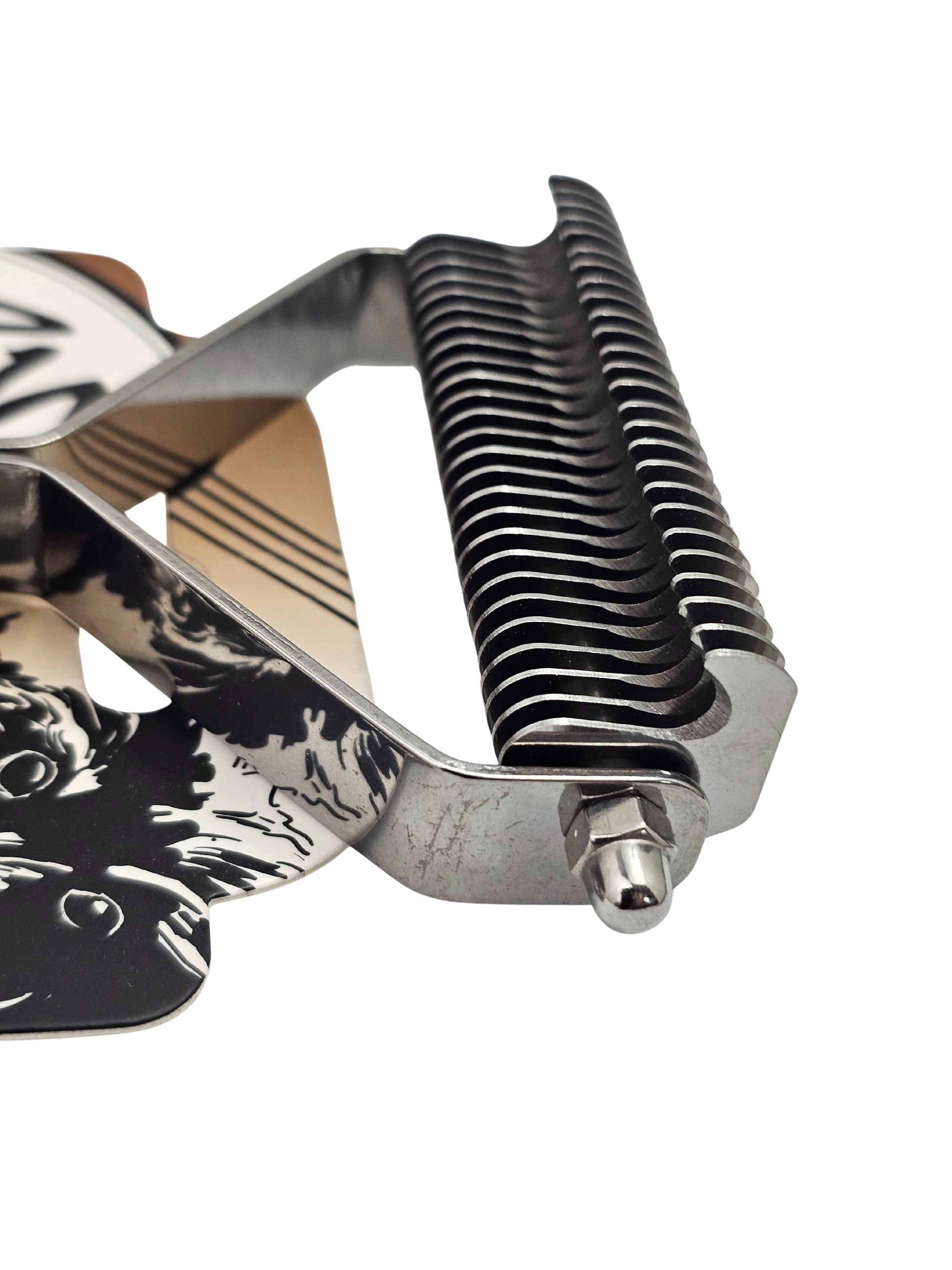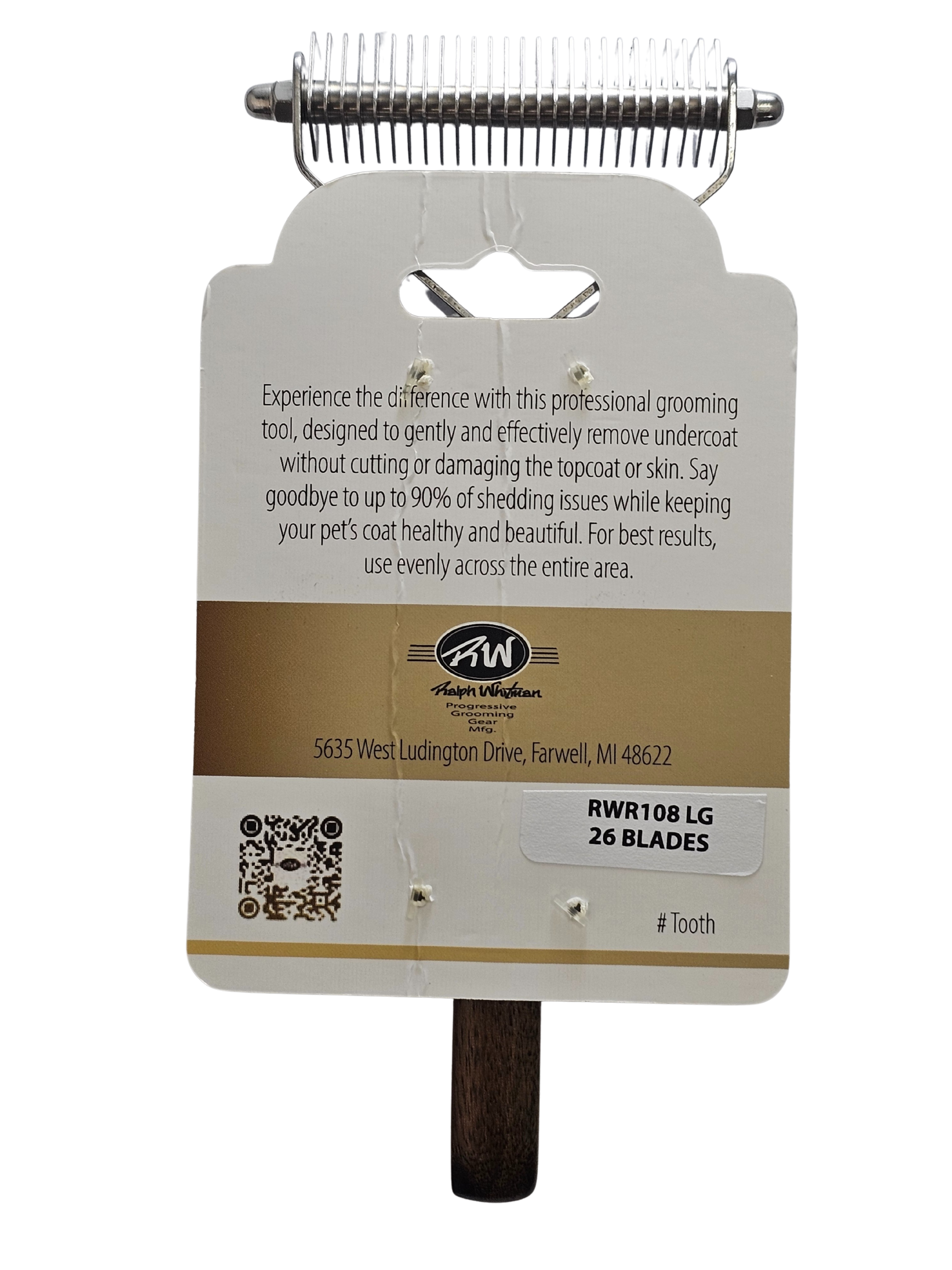 Designed for professional grooming, the RW Rake features precise teeth that gently remove loose undercoat from smooth, long, and double-coated breeds. This rake effectively reduces shedding by up to 90% without damaging the topcoat or skin, promoting a healthy, well groomed appearance. For optimal results, use evenly across the entire coat to maintain your pet’s comfort and coat quality.